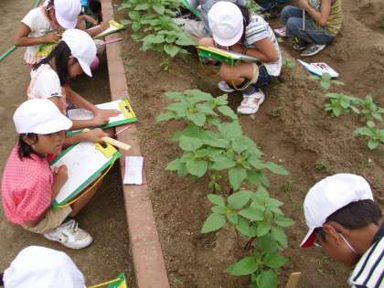 そして学習園に目を向けてみると3年生がひまわりの観察をしていました。少し大きくなったひまわりをみながら一生懸命絵を描いていました。