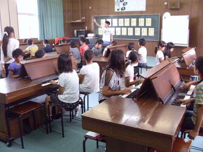 4年2組は音楽室でオルガンの鍵盤の触り方を学習していました。