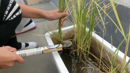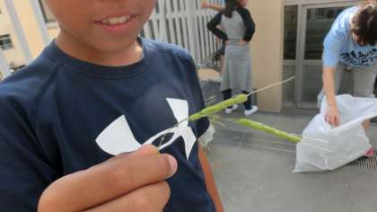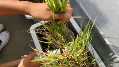 1学期から植えていた稲を刈りをしました。鎌で丁寧に稲穂を刈り取る作業などをしました。