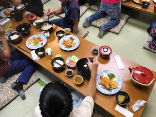 宿舎に入り、現在夕食中です。たくさん歩いたのでお腹ペコペコのようです。 今日のお知らせは以上です。今後の活動は明日以降ご紹介します。