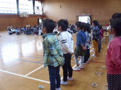 今日は異学年集会がありました。1・6年生の集会では、1年生歌と合奏を6年生に披露しました。明日のキッズフェスティバルの練習で、発表の後、6年生からアドバイスをもらっていました。