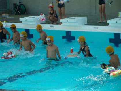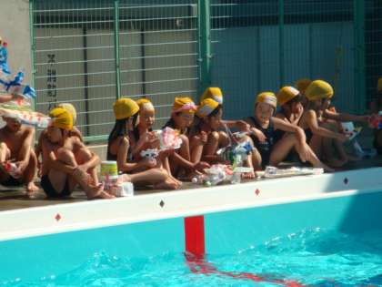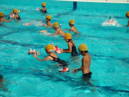 波を作って25m進ませたり、みんなで大きく回る洗濯機(波のプールを作ること)をし、泳ぎながら船を浮かばせたりしました。