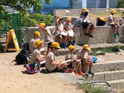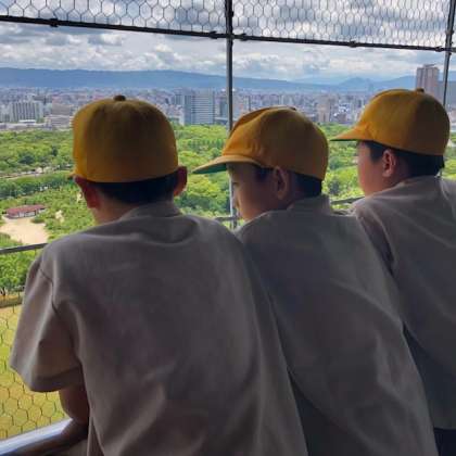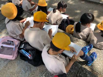 大阪城公園では大阪城をスケッチしました。一人一人構図を考えながら丁寧に描いていました。また、大阪城の見学もしました。天守閣の最上階からの景色にとても感動していました。