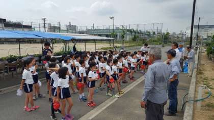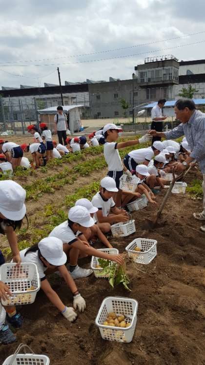 今年も地域の方々のご厚意で、3年生が加賀屋農園のじゃがいもほりを体験させていただきました。男爵とメークインを一人一株ずつほらせていただき、土の中から大きなじゃがいもが見えた時は大きな歓声が上がりました。虫が出てきたときは大騒ぎでしたが…。帰りには袋いっぱいのじゃがいもを持って、大満足の様子でした。
