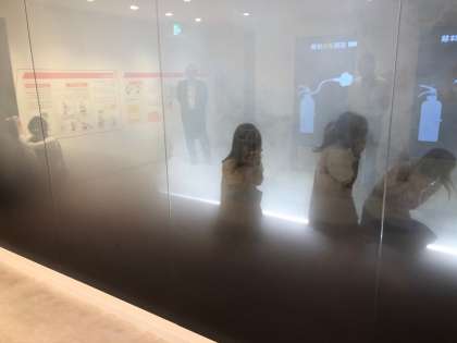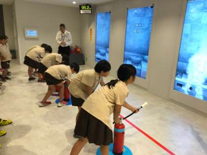 阿倍野防災センターでは東日本大震災について学習し、火災時の煙の中を歩く体験や「震度5」相当の揺れを体験しました。