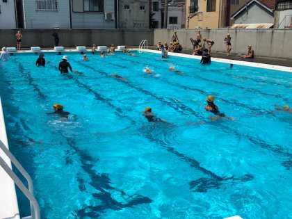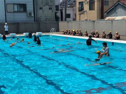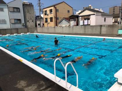 水泳特練では、「25mを泳げないこどもたちがなんとか25mを泳ぎきる」ことを大きな目標にしています。子どもたちを少ない人数でグループ分けをして、泳力の向上に取り組んでいます。今日で2日目ですがその成果がどんどんと表れてきました。