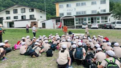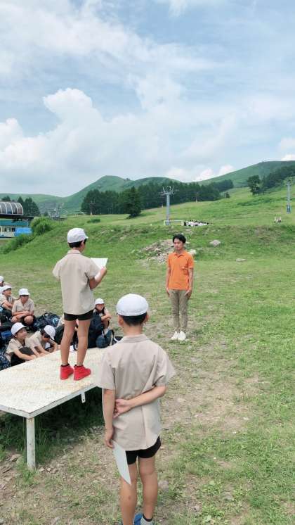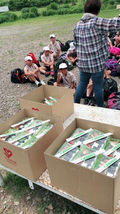 後方に高丸山が見えています。開舎式では、5年生が作った「旗」を掲揚しました。開舎式が終わるとお弁当タイムです。