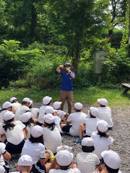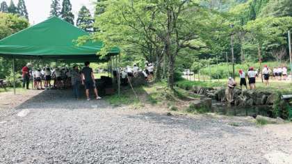 魚つかみの会場が少し混んでいて、予定を少し変え、先に焼き板をすることになりました。焼き板工作は磨き作業が真っ黒になります。しっかり磨いて明日の色付けに備えます。焼き板磨きをしている横の川が魚つかみの場所です。