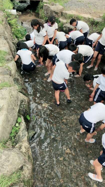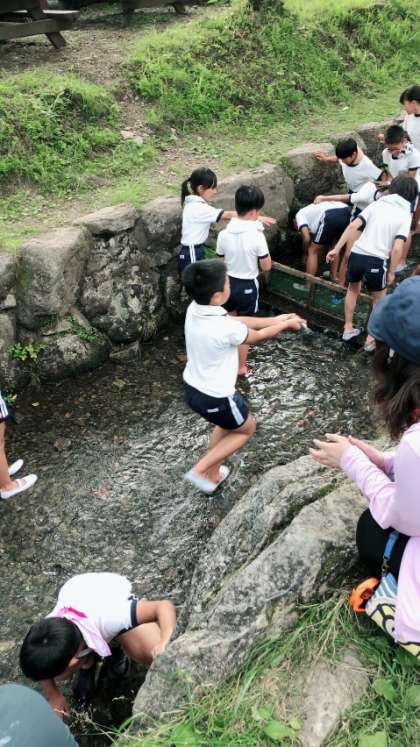 「きゃー、冷たい〜」、「魚が逃げる〜」、「つかめない〜」みんな川に入って魚たちとかくとうしています。しっかりつかまないとすぐにスルリとにげてしまいます。