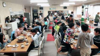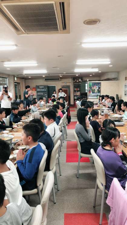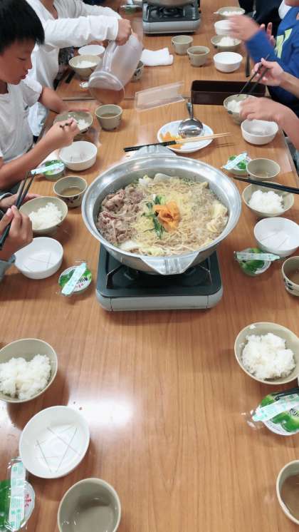 班で協力して準備をした本日の晩御飯のメニューは「かもなべ」です。ラーメンも入っていて美味しそう〜に炊けていますね。お出汁までおいしい「かもなべ」に、デザートは青リンゴゼリーが付きます。