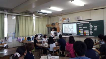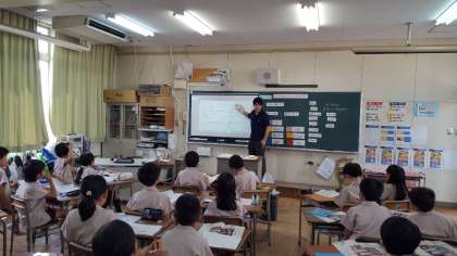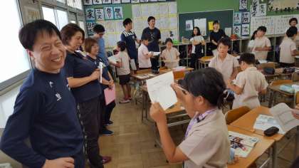 5時間目の研究授業の様子です。「Do you have〜?」と教室内を歩きまわり、友達や見ている先生に質問します。私も何人かに「Do you have a pen?」と聞かれました。家でも「Do you have〜?」と聞いてみてください。