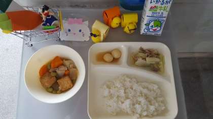 鶏肉とさといもの煮物、豚肉とキャベツの炒め物、みたらしだんご、ごはん、牛乳で、季節行事献立でした。さて、ここでクイズです。今日はなんの季節行事なのでしょう?