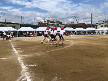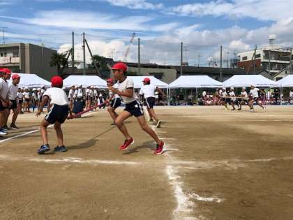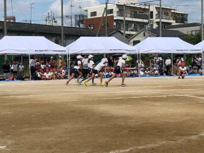 4年生の団体競技は「ぼくらの旋風記」。小さく回るのが難しく、チームワークが必要とされます。どちらも譲らず、接戦となりました。
