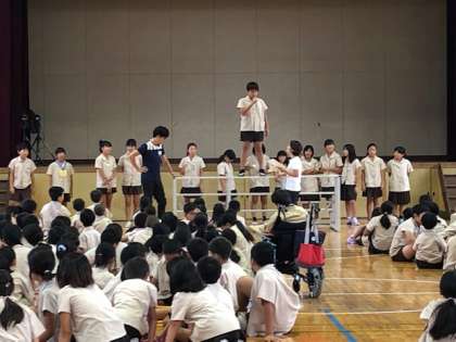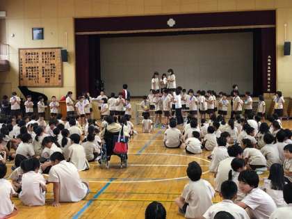 今日の児童集会は、お誕生日集会と鼻歌クイズでした。