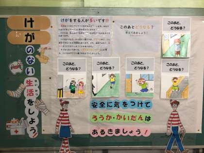 10月の保健室掲示は、「けがのない生活をしよう!」です。安全に気を付けて日常生活や学校生活を送り、けがをせず安全に過ごしてほしいです。