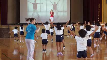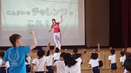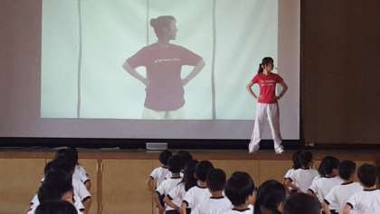 今日、OSK日本歌劇団で活躍する劇団員によるダンスの出前授業がありました。子どもたちは、速いテンポのラインダンスに苦戦しながらも、「上手くできなくても、笑顔で踊ることが大切」だと教えてもらい、何度も繰り返し練習し、最後にはみんなでかっこ良く笑顔でポーズを決めることができました。