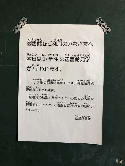 三年生が図書館見学をした時、西成図書館の前に張り出してくださったお知らせ掲示です。