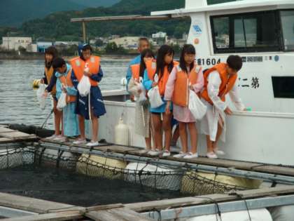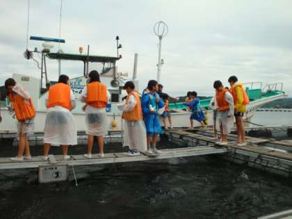 船からいかだに乗り移り、鯛に餌やりをしているところです。