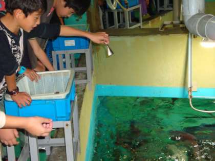 その後、水族館のバックヤードに入らせていただき、カンパチに餌をあげました。