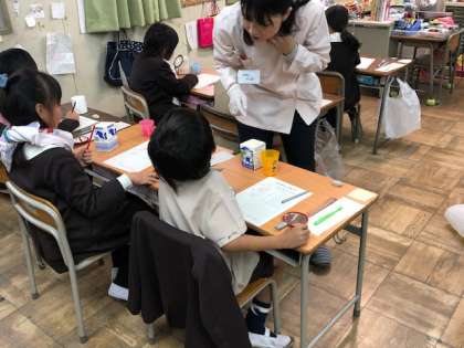 歯の1本を染め出しし、みがき残しを調べました。はぐきの近くや歯と歯の間に歯垢が残っていた子どももいました。歯みがき名人を目指してほしいと思います。