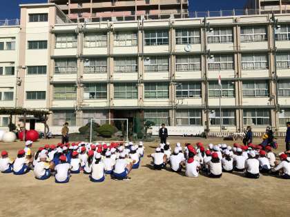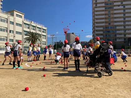 少し肌寒い中、加賀屋東小学校で6年生の交流会がありました。夏の水泳交流に続いて2回目の今回は「ミニ運動会」を行いました。