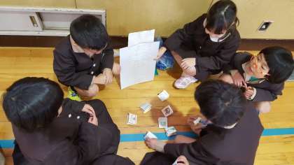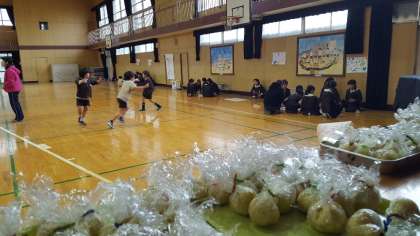 2年生が1年生を招待して、おいもパーティーが開かれました。はじめは、体育館で2年生が準備したさかなつりやどうぶつクイズどうぶつ、すごろく、ぴょんうさぎ、ぱっちんかえるのあそびコーナーめぐりから始まりました。どのあそびコーナーも大変盛り上がりました。