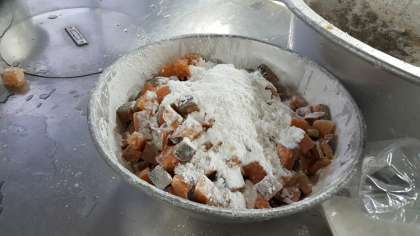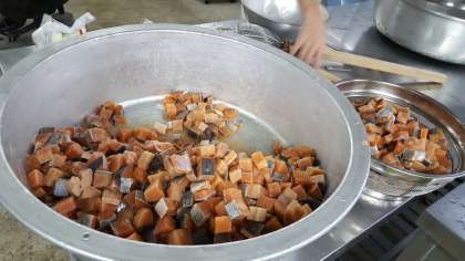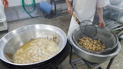 今日の給食の「さけのマリネ」ができる様子を紹介します。片栗粉をまぶして高温の油であげます。大きな鍋で全校300人以上を作ってくださいました。