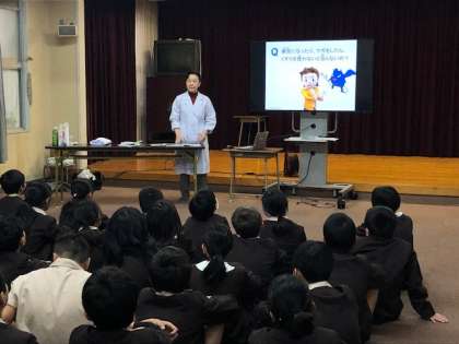 今日は、学校薬剤師の大壁先生を招いて薬に関する正しい知識を身につけるために出前授業を受けました。