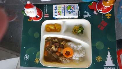 「冬野菜のカレーライス!」でした。「ラッキーにんじん」の他、「ラッキーだいこん」も入っていました。牛肉もいっぱい入っていて大変おいしかったです。