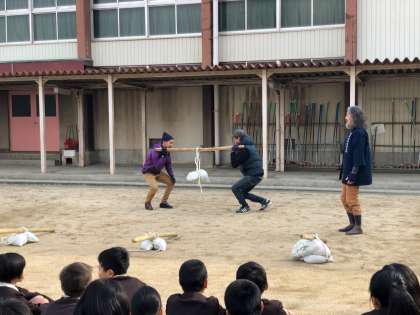 今日は造園業を営んでおられる松村さん他2名の方から、6年生の理科「てこの力」の応用の出前授業をしていただきました。普段砂や土を運んだり、大きな庭石を動かしたりするのに「てこの力」が応用されていることに、子どもたちは大いに感心していました。実際に力を合わせて作業した経験は、きっと将来必ず役に立つことと思います。よくがんばりました!