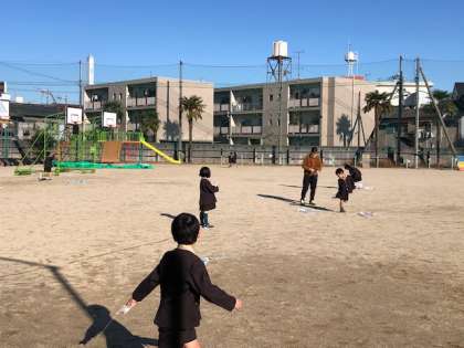 今日は晴天で、風があまりなかったので、「しんどい!」と言いながらも、走り回ってたこを高くあげていました。みんな、たこを風にのせ、糸を伸ばす感覚を楽しんでいました。