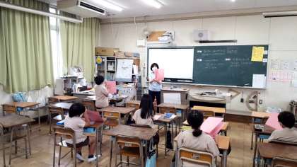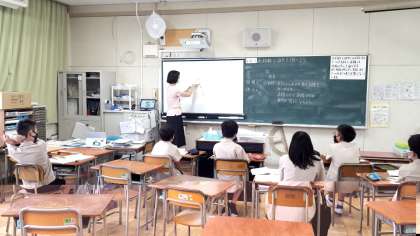 (写真は今日の6年生の算数「点対称」、家庭科室での5年生の給食、4年生の「ファイル作成」の様子です)