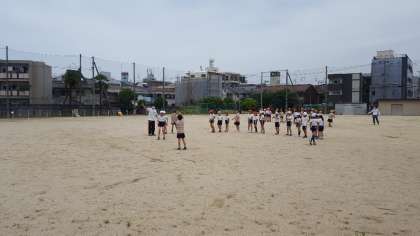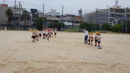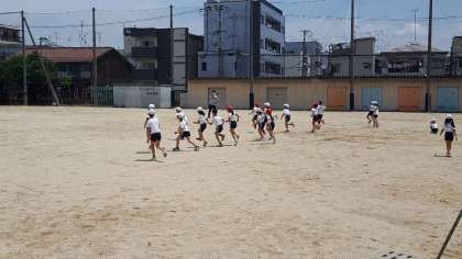 体育の学習も始まりました。暑さに気をつけて短時間で運動していました。2年生は横一列に並んで「走る」運動を、3年生は「大なわとび」をしていました。