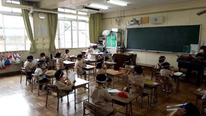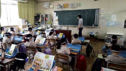 1、2年生はフェイスシールドをつけて歌を歌ったり、鍵盤ハーモニカの練習をしたりしていました.