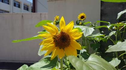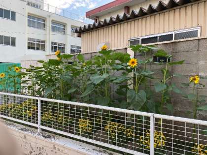 地域の花咲かせ隊の方々が毎日の水やりを含め育ててくださっている「向日葵(ひまわり)」の花が咲きました。日中は名前の通り、太陽の方を向いていました。玄関と東門をお通りの際はぜひ観賞してください。