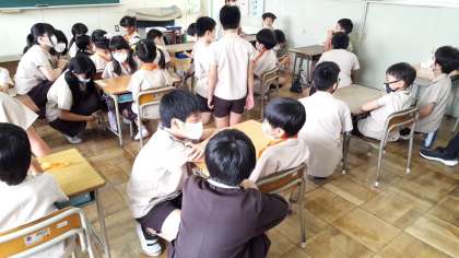 今日は1年生の教室へ6年生がやってきました。1年生から見ると大きなお兄さん、おねえさんたちです。メダルのプレゼントを渡すところから交流会が始まりました。6年生も姿勢を低くしてお話ししていました。自分が1年生だったころと重なったかな?