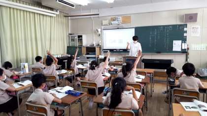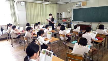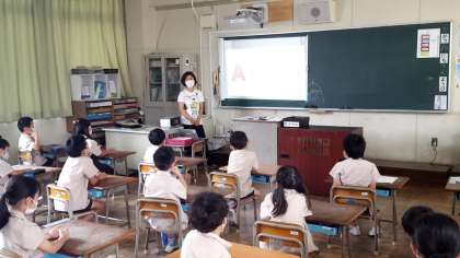 1年2組では朝から「A、B、C〜…」と画面を見ながらアルファベットを学習していました。3年生は5時間目どちらのクラスも国語の学習でした。木の葉が枯れると色が変わることを、教室でアゲハの幼虫を飼っていたミカンの葉の様子から学んでいました。