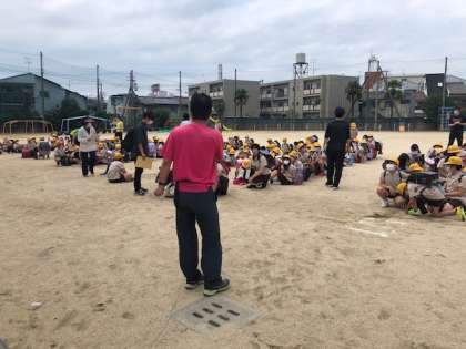 係の先生の話が終わった後、1年生から6年生までの全ての子どもたちが、自分の近所に住んでいる地区別に分かれて集団下校しました。