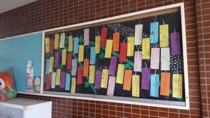 玄関入って管理作業員室前の掲示板と南館中央階段1-2F踊り場にはそれぞれ4年生、1年生の作った飾りが飾られていました。早いもので来週7月も2週目を迎えますが、次週以降も「健康」・「元気」を最重要目標として取り組んでいきます。毎日の検温をはじめ、水筒やマスク・ハンカチ・ティッシュなどの持ち物の点検等ありがとうございます。来週もどうぞよろしくお願いします。