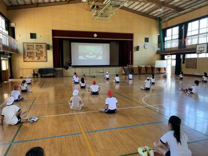 (※真ん中の写真は体育館で柔軟体操をする5年生の様子です。)