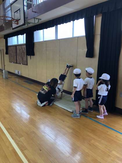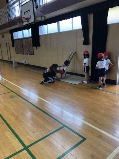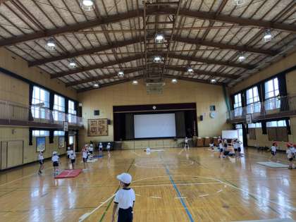 雨続きですが、体育もがんばっています。1年生はサーキット形式で広い体育館をいっぱいに使ってぐるぐると運動をしていました。雨で外遊びができない分、広い体育館で力いっぱい運動できました。