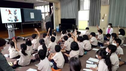 C−NETの先生が、春spring夏summer秋fall冬winter 四季の季節的な言葉を取り入れたゲーム形式の楽しいレッスンをしてくださいました。午前中は5,6年生が、午後は3、4年生が学年ごとに、6時間目までフルタイムで教えていただきました。Let's have fun!(楽しんでね!)この気持ち、とっても大切にしたいと思いました。