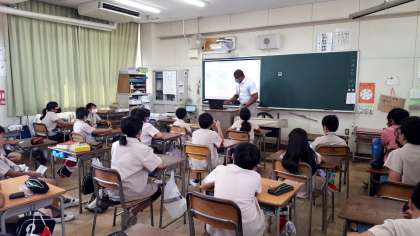 5年生の2クラスの他、今日は4年生も多目的室で自己紹介のプレゼンテーションを見ました。どんな先生だったか、家で聞いてみてください。
