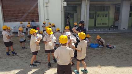 午後、良い天気になった中運動場では1年生がいろいろなシャボン玉を作って飛ばしていました。大きなたらいにシャボン玉液がいっぱい作ってあり、定番のストロー以外にも、うちわの骨やハンガーを使ってみんな元気いっぱい!シャボン玉を飛ばしていました。
