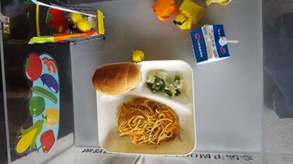 イタリアンスパゲッティ、グリーンアスパラガスとキャベツのサラダ、1/2黒糖パン、牛乳でした。
