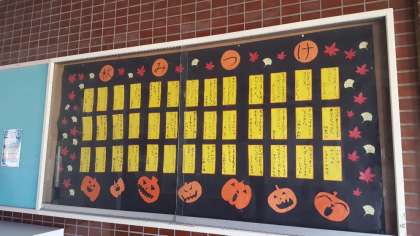 玄関には2年生が「あきみつけ」の掲示をしてくれました。土日も「秋(あき)」を見つけられるかな?夜は布団をあったかくして休んでくださいね。