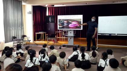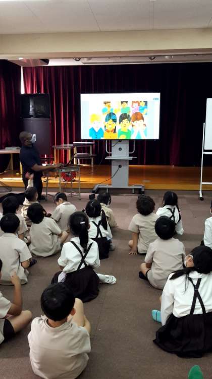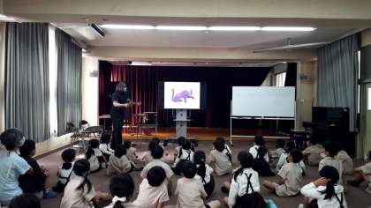 今日は特別にC-NETの授業がありました。普段は5・6年の高学年の授業なのですが、今日はSpecial Monday!3,4年生は学級ごとに、1,2年生は学年でそれぞれ授業がありました。1年生は先生の声に合わせて色や動物の言い方を大きな声でレッスンしていました。