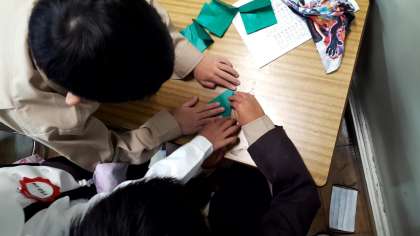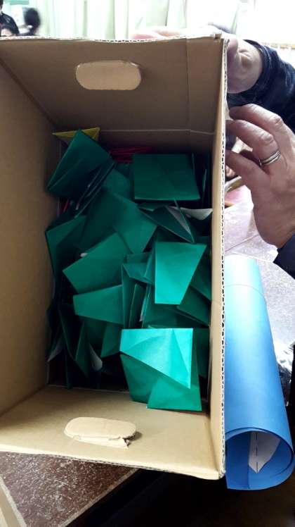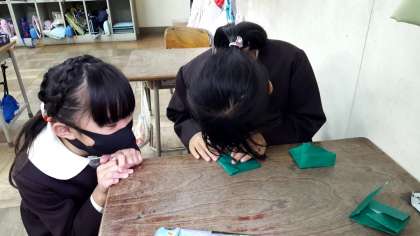 住之江区まちづくりセンターの方から教えていただいた情報をもとに、本校でも児童会を中心に取り組んでいます。低学年が初めのところを折り、中学年、高学年と折った折り紙を送っていきます。果たしてどれくらいの数の「さざんか」を折ることができるでしょうか?今から楽しみです。