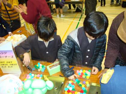 また、廃材を使った作品を作るコーナーがあったり、コップを高く積み上げたり、ボール素早く移し替えたりするコーナーもありました。