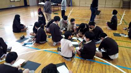 自分たちの撮った写真に題名をつけ、作品展に向けて体育館で飾り付けをしました。